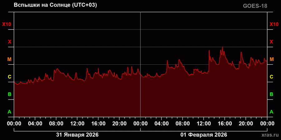 За минувшие сутки было зафиксировано беспрецедентное количество солнечных вспышек — 17 мощных событий, большинство из которых достигло уровней M и выше. По состоянию на сегодняшний день, последний рекорд по количеству мощных вспышек был установлен лишь однажды за последние десять лет — 29 декабря 2024 года. Собятия 1 февраля 2026 года теперь занимают второе место. По словам учёных, Солнце переживает чрезвычайно активный период, демонстрируя невероятную энергетическую активность. Постоянные мощные вспышки стали своеобразным предохранительным клапаном, препятствующим накоплению энергии внутри светила, которое иначе могло бы привести к событиям X-класса. Энергия, поступающая из глубин Солнца, неизбежно превысит способность системы справляться с её утилизацией в рамках текущих вспышек среднего уровня. Это приведёт к началу взрывов значительно большей мощности, способствующих резкому росту числа высокоэнергетичных вспышек класса X. Риск влияния на Землю возрастает Хотя пока прямой угрозы Земле солнечные вспышки не представляют, изменения ситуации ожидаются буквально в течение 24 часов. Пока зона активного центра находится на расстоянии порядка 50 градусов от направления Земля-Солнце, риск непосредственного удара минимален. Однако начиная со второго февраля активное пятно выйдет в положение, угрожающее нашей планете прямыми последствиями своей активности вплоть до 7 февраля включительно. Мощнейшие выбросы плазмы и частиц, сопровождающие крупные вспышки, способны оказать значительное влияние на земные коммуникации, навигационные системы и инфраструктуру, включая спутники и наземные сети электроснабжения, сообщает Лаборатория солнечной астрономии (ИКИ РАН и ИСЗФ СО РАН).